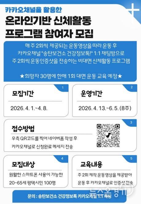 프로그램 참여 방법은 카카오톡 채널 ‘송탄보건소 건강정보톡!’을 추가한 후 네이버 폼을 통해 신청서를 제출하면 된다.