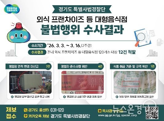 뉴스온경기 | 경기도 특별사법경찰단은 지난 3월 3일부터 16일까지 도내 외식 프랜차이즈 등 대형음식점 120개소를 대상으로 집중 수사를 실시한 결과 영업장 면적 변경 미신고 및 영업자 준수사항 위반 등 총 12건의 불법행위를 적발했다.