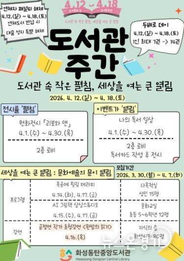 뉴스온경기 | 화성동탄중앙도서관은 지난해 11월 3일 개관 이후 처음 맞이하는 도서관주간을 기념해 시민들이 다양한 독서·문화생활을 즐길 수 있도록 도서관주간 특별 프로그램을 운영한다고 밝혔다.