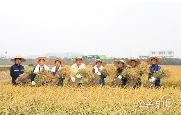 추수 행사가 열린 파평면 장파 경기미 생산단지는 180ha 규모로, 33개 농가가 2014년 경기도농업기술원이 육성한 친환경·무농약 벼 ‘삼광미와 참드림미’를 재배하고 있다.