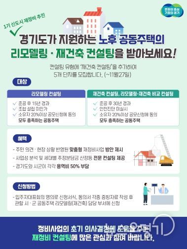 뉴스온경기 한민규 기자 | 경기도가 올해 하반기 ‘공동주택 재정비 컨설팅 사업’ 기존 유형인 리모델링, 리모델링-재건축 비교에 재건축을 추가해 5개 단지를 지원한다.