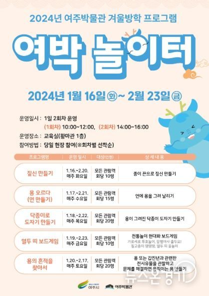 뉴스온경기 한민규 기자 | 여주시 여주박물관에서는 1월 16일부터 2월 23일까지 갑진년 용의 해를 맞아 용과 관련한 다양한 겨울방학 프로그램을 운영한다.