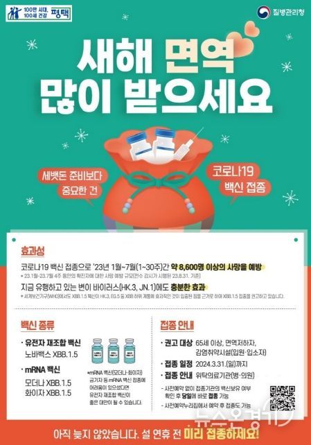 평택보건소 관계자는 “65세 이상 등 고위험군은 아직 접종을 하지 않았다면 코로나19 감염 예방을 위해 접종이 필요하다”라며, “고위험군의 사망과 중증화 예방을 위해 충분한 면역을 갖추고 건강한 설 명절을 맞이하길 부탁드린다”라고 말했다.