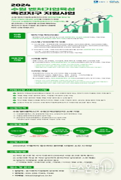 뉴스온경기 한민규 기자 | 수원시가 ‘2024 수원 벤처기업육성촉진지구 지원사업’에 참여할 기업을 모집한다.
