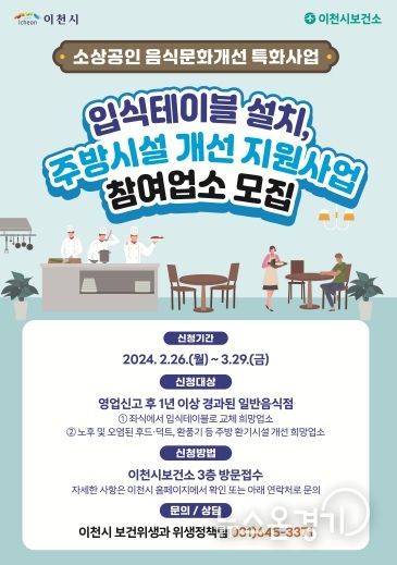 사업 신청은 2월 26일부터 3월 29까지 이천시보건소 보건위생과 위생정책팀으로 방문 접수하며, 제출 서류는 이천시 홈페이지 공고문에서 확인 가능하다.