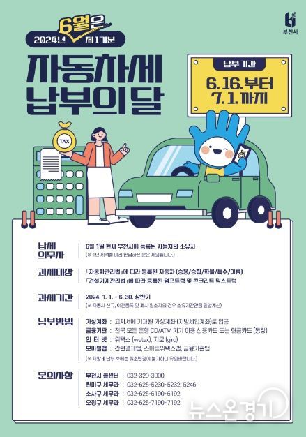 자동차세는 1년에 두 번 6월과 12월에 부과되며, 이번 6월 제1기분 자동차세는 1월 1일부터 6월 30일까지 소유 기간에 대한 부과분이다. 부과 대상은 6월 1일 과세기준일 현재 자동차 등록 원부상 부천시에 등록된 차량(자동차, 125cc초과 이륜차, 기계장비)의 소유자다.