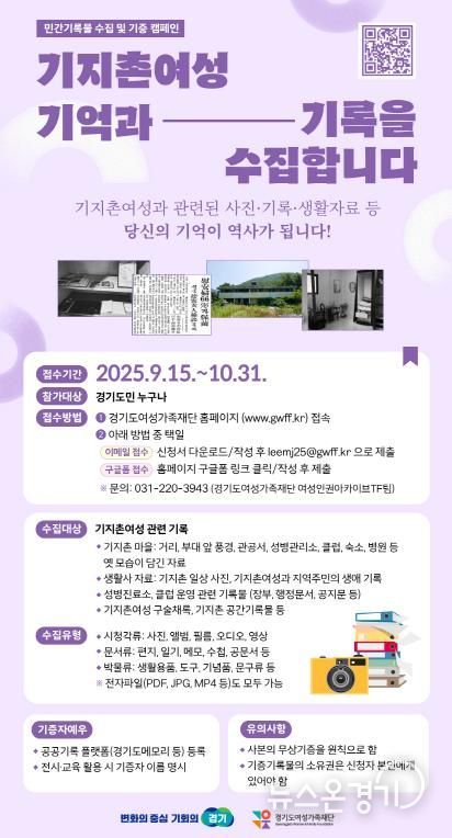 뉴스온경기 | 경기도와 경기도여성가족재단은 ‘기지촌여성 인권 기록 아카이브 구축사업’의 하나로, ‘기지촌여성 민간기록물 수집 및 기증 캠페인’을 9월 15일부터 10월 31일까지 추진한다.