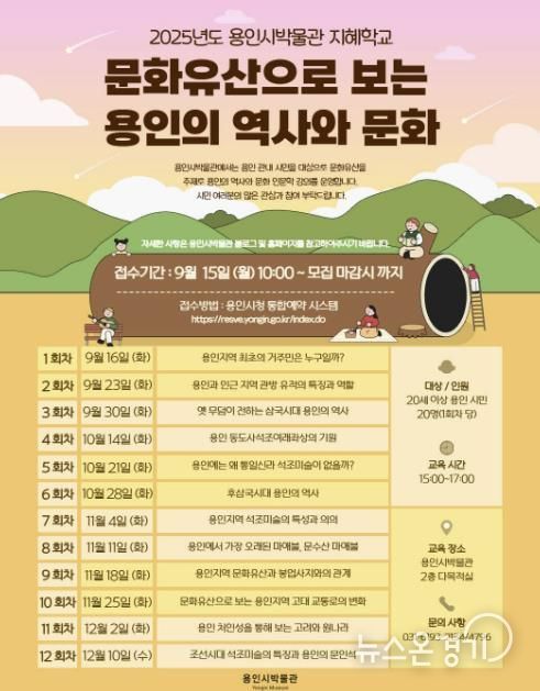 뉴스온경기 | 용인특례시는 9월 16일부터 12월 10일까지 용인시박물관에서 인문학 강좌 ‘문화유산으로 보는 용인의 역사와 문화’를 총 13회 운영한다고 15일 밝혔다.