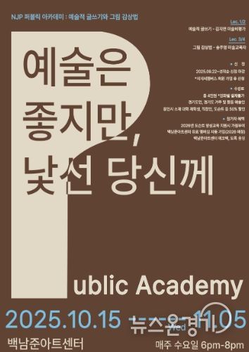 뉴스온경기 | 경기문화재단 백남준아트센터가 오는 10월 15일부터 11월 5일까지 매주 수요일 저녁, 성인 대상 프로그램 ‘NJP+ 퍼블릭 아카데미: 예술적 글쓰기와 그림 감상법’을 운영한다. 이번 아카데미는 예술은 좋지만 다소 낯설게 느껴졌던 성인들에게, 작품과 친밀하게 소통하고 자기만의 언어로 표현하는 방법을 제시하는 실습과 강의가 접목된 과정이다.