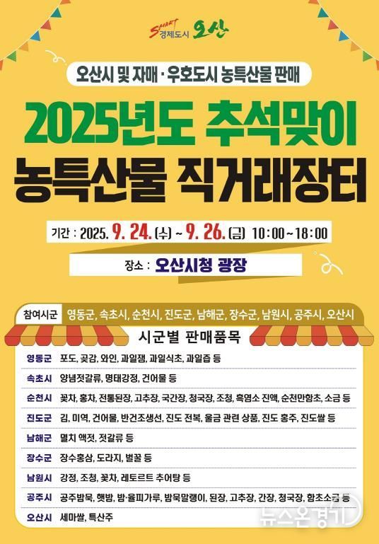 뉴스온경기 | 오산시는 민족 최대 명절 추석을 맞아 오는 24일(수)부터 26일(금)까지 3일간 오산시청 광장에서 ‘추석맞이 자매도시 농특산물 직거래장터’를 개최한다고 밝혔다.