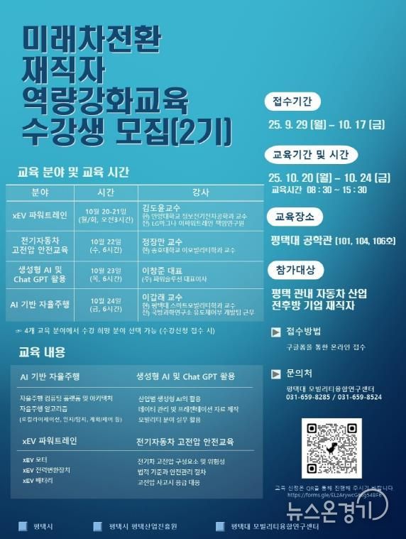 뉴스온경기 | 평택시와 평택산업진흥원이 ‘미래차 전환 재직자 역량 강화교육’ 2기 과정을 개설한다. 교육은 10월 20일부터 24일까지 교육 운영기관인 평택대학교에서 진행되며, 지역 자동차 산업 재직자를 대상으로 미래차 핵심 분야 전문지식을 제공한다.