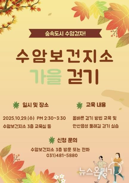 뉴스온경기 | 안산시 상록수보건소 수암보건지소는 지역 주민의 건강증진을 도모하기 위해 ‘수암 가을 걷기 교실’ 참가자를 모집한다고 14일 밝혔다.