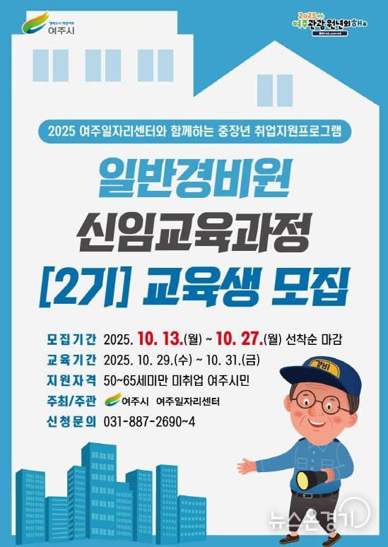 뉴스온경기 | 여주시는 10월 13일부터 10월 27일까지 베이비부머(중장년) 취업지원을 위한 ‘2025년 일반경비원 신임교육과정 2기 교육생’을 모집한다.