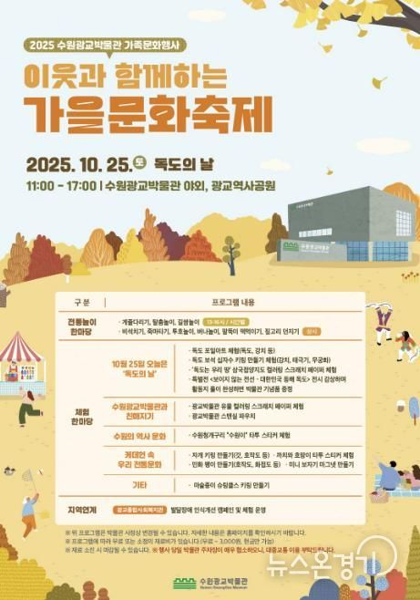 뉴스온경기 | 수원광교박물관은 독도의 날인 10월 25일 오전 11시부터 오후 5시까지 수원광교박물관 야외(광교역사공원)에서 ‘2025 수원광교박물관 가족문화행사–이웃과 함께하는 가을문화축제’를 연다.