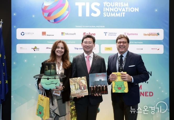 뉴스온경기 | 이상일 용인특례시장은 23일 오후(현지 시간) '관광 혁신 서밋(Tourism Innovation Summit) 2025'가 열리고 있는 스페인 세비야의 피베스에서 호세 루이스 산스 세비야 시장에게 용인을 알리는 특별한 선물을 전달했다.
