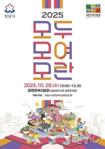 뉴스온경기 | 성남시는 오는 10월 29일 오전 10시부터 오후 3시 30분까지 모란민속5일장(중원구 둔촌대로 68)에서 ‘2025 모두모여모란’ 축제를 연다.