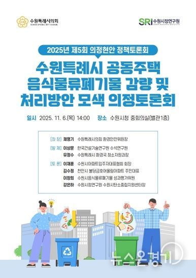 뉴스온경기 | 수원특례시의회 환경안전위원회는 11월 6일, 오후 2시, 수원시청 별관 1층 중회의실에서 ‘공동주택 음식물류폐기물 감량 및 처리방안 모색을 위한 의정토론회’를 개최한다고 밝혔다.