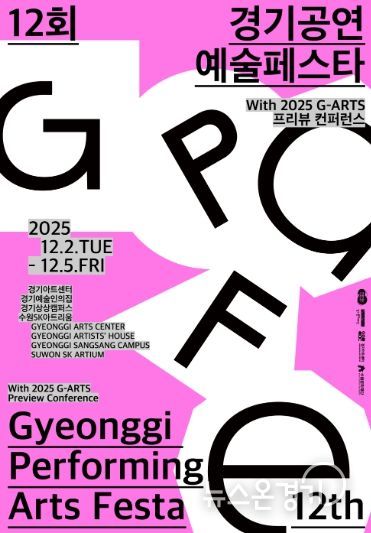 뉴스온경기 | 경기문화재단은 경기도 수원 일대에서 제12회 경기공연예술페스타를 개최한다. 페스타는 2025년 12월 2일부터 5일까지 경기 예술인의 집, 경기아트센터, 경기상상캠퍼스, 수원SK아트리움 등에서 진행되며, 베스트콜렉션, 쇼케이스 데이, 공동 창·제작 쇼케이스, 피치세션, 토크세션, 워크숍 등 다양한 프로그램을 통해 경기 공연예술 생태계의 흐름과 성과를 한눈에 보여줄 예정이다. 또한 경기아트센터 주최 ‘2025 G-ARTS 프리뷰 컨퍼런스’가 동시 개최되며, 보다 풍성한 전문 교류의 장을 마련한다.