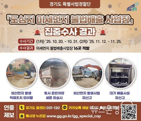 뉴스온경기 | 경기도는 도심지 미세먼지 발생사업장 330개를 대상으로 불법 배출 행위를 집중 수사해 대기환경보전법 위반 사업장 16개를 적발했다고 9일 밝혔다.