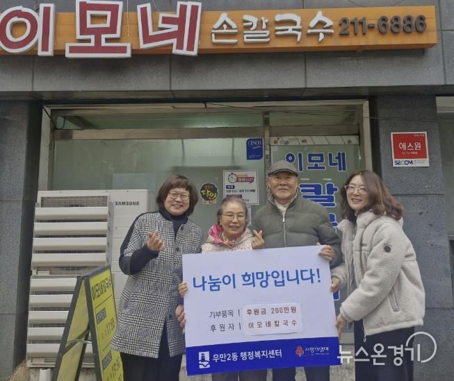 뉴스온경기 | 수원시 팔달구 우만2동은 지난 23일, 이모네칼국수와 함께 이웃나눔 후원금 전달식을 진행했다고 밝혔다.