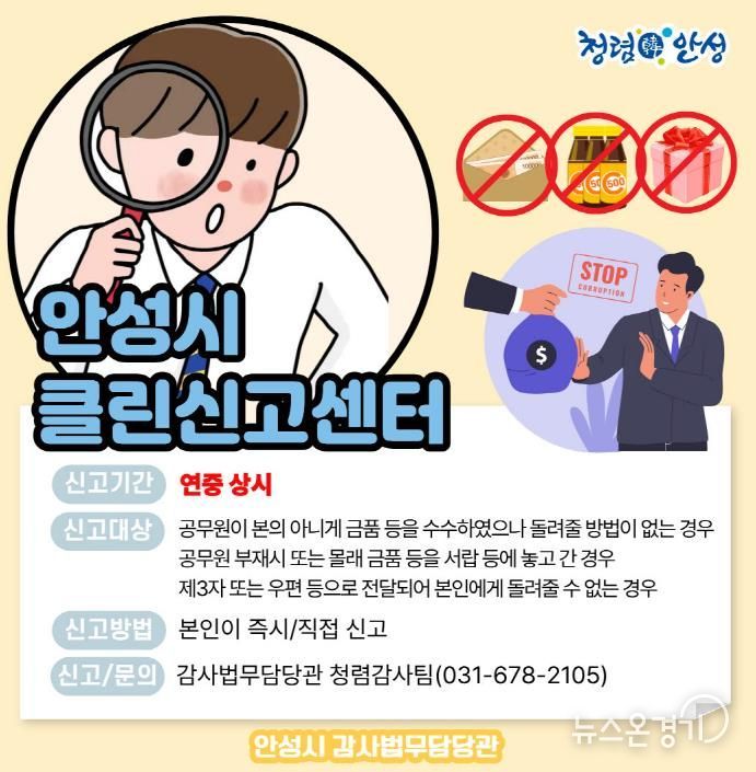 뉴스온경기 | 안성시는 시민들에게 신뢰받는 공정하고 투명한 행정 서비스를 제공하기 위해 ‘클린신고센터’를 연중 상시운영하며 청렴한 행정문화 정착에 힘쓰고 있다고 밝혔다.