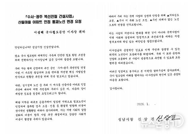 뉴스온경기 | 성남시는 지난 16일 김윤덕 국토교통부 장관과 이성해 국가철도공단 이사장에게 ‘수서~광주 복선전철(이하 수광선) 건설사업’과 관련하여 여수동 산들마을 아파트 인접 통과 구간의 노선 변경을 요청하는 서한을 전달했다고 20일 밝혔다.