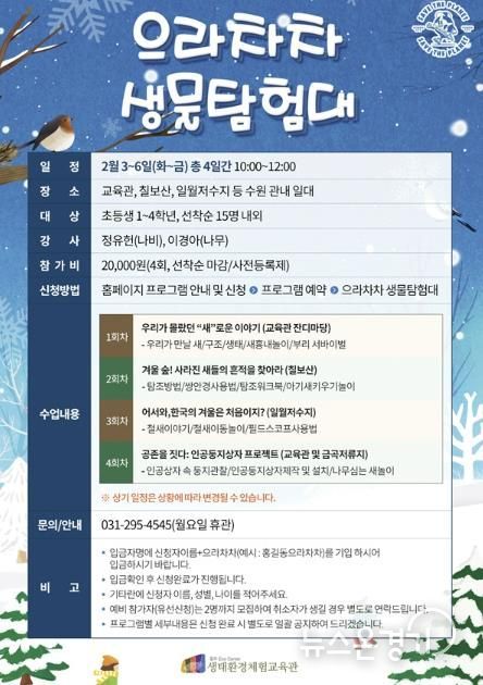 뉴스온경기 | 칠보생태환경체험교육관이 겨울방학 프로그램 ‘으라차차 생물탐험대(겨울 탐조프로젝트)’에 참여할 초등학교 1~4학년 어린이 15명을 선착순으로 모집한다.