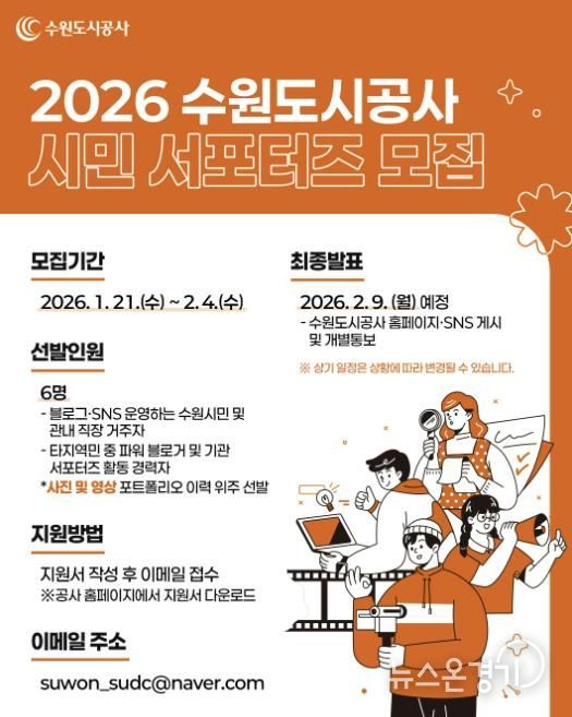 뉴스온경기 | 수원도시공사가 21일부터 다음 달 4일까지 2026년도 제8기 시민 서포터즈를 모집한다.