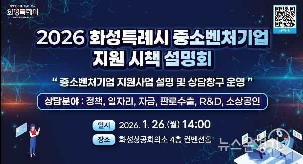 뉴스온경기 | 화성특례시가 관내 중소기업과 소상공인의 경영 애로 해소와 지원사업 활용도를 높이기 위해 오는 26일 화성상공회의소 컨벤션홀에서 ‘2026년 화성특례시 중소벤처기업 지원 시책 설명회’를 개최한다.
