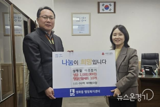 뉴스온경기 | 수원시 장안구 영화동 111-3구역 주택재개발정비사업조합이 지난 28일, 설 명절을 맞아 영화동 행정복지센터에 130만원 상당의 후원금품을 전달했다.