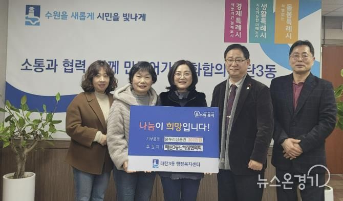 뉴스온경기 | 수원시 영통구 매탄3동은 지난 3일 매탄3동 단체장협의회가 다가오는 설 명절을 맞아 관내 어려운 이웃들을 위해 누리상품권 300장(총 300만원 상당)을 기부했다고 밝혔다.