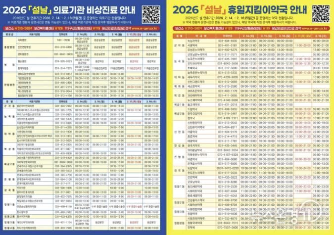 설 연휴 기간 의료기관 비상진료 및 휴일지킴이 약국 운영 현황은 시흥시청 누리집 새소식 게시판과 시흥시 블로그에 게시된 홍보물의 정보무늬(큐알코드)를 통해 실시간으로 확인할 수 있다.
