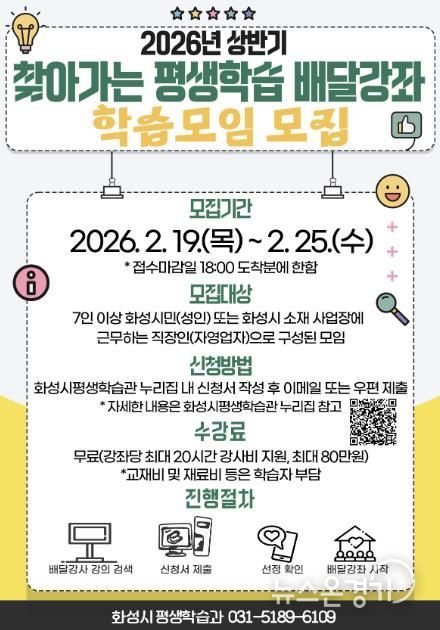 뉴스온경기 | 화성특례시는 2월 19일부터 2월 25일까지 2026년 상반기'찾아가는 평생학습 배달강좌'학습모임을 모집한다.