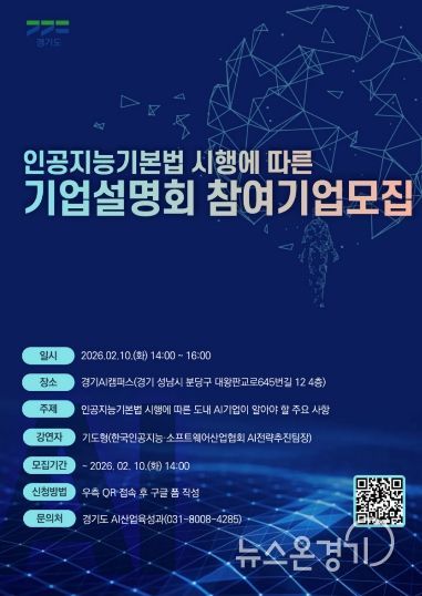 뉴스온경기 | 경기도가 지난 1월 22일 시행된 ‘인공지능 기본법’에 대한 도내 기업들의 이해를 돕기 위해 10일 오후 2시 판교 경기AI캠퍼스에서 AI 기업 대상 설명회를 개최한다.