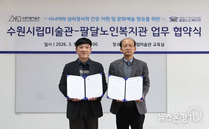 수원시립미술관에서 열린 협약식에는 남기민 수원시립미술관장, 윤학수 팔달노인복지관장을 비롯한 양 기관 관계자들이 참석했다. 두 기관은 이번 업무협약을 계기로 지역 시니어의 심리ㆍ정서적 건강을 지원하고 문화예술 참여를 확대하기 위한 협력 체계를 구축하기로 했다.