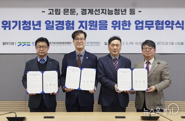 뉴스온경기 | 경기도와 경기도미래세대재단, 한국승강기안전공단 경인지역본부는 5일 경기도청 서희홀에서 ‘위기청년 일경험 지원을 위한 업무협약’을 체결했다.