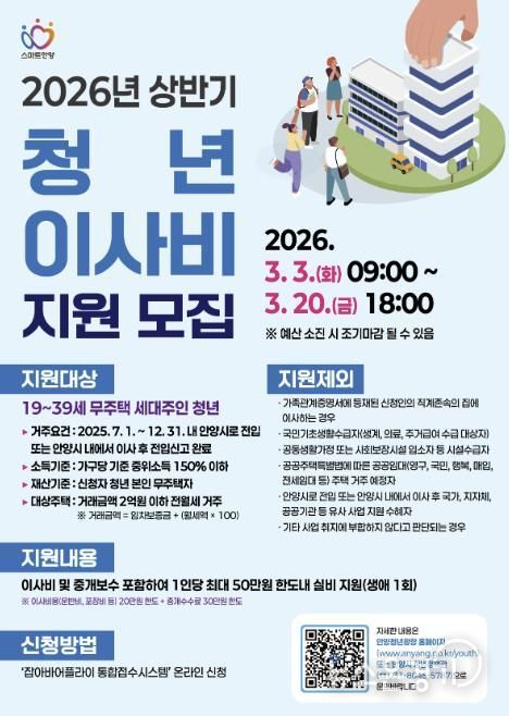 시는 2025년 7월 1일부터 12월 31일 내 안양시로 전입하거나 안양시 내에서 이사한 후 전입신고를 완료한 19세 이상 39세 이하의 청년 가구에게 1인당 최대 50만원 한도 내에서 이사비 및 중개보수비를 지원한다.
