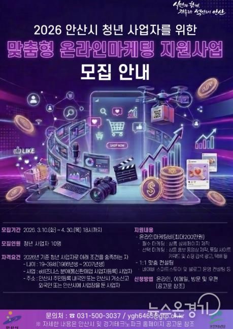 뉴스온경기 | 안산시는 온라인 시장에서 상품 홍보와 매출 확대를 희망하는 청년 사업자를 대상으로 ‘맞춤형 온라인마케팅 지원사업’ 참여자를 모집한다고 11일 밝혔다.