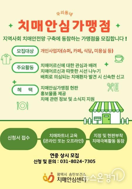 뉴스온경기 | 평택시 송탄치매안심센터는 지역사회 내 치매 친화적 환경 조성과 촘촘한 치매 안전망 구축을 위해 ‘치매안심가맹점’을 신규 모집한다고 밝혔다.