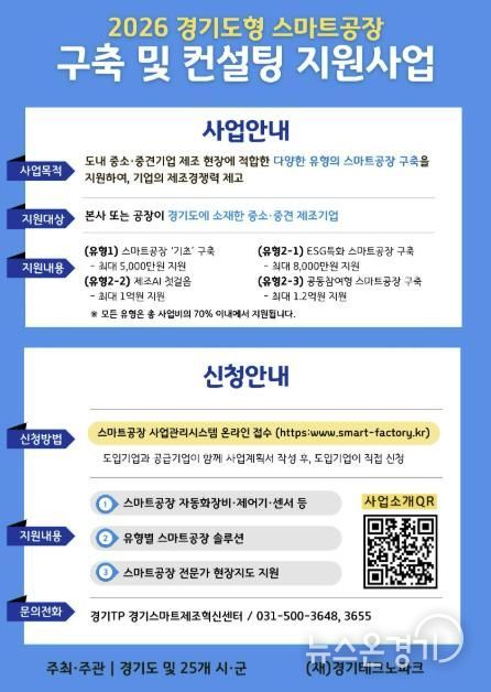 뉴스온경기 | 수원특례시가 경기도와 함께 ‘2026년 경기도형 스마트공장 구축 및 컨설팅 지원사업’ 참여 기업을 공모한다. 경기도 22개 시군 소재 중소제조기업을 지원하는데, 수원시 기업은 4개사를 선정할 예정이다.