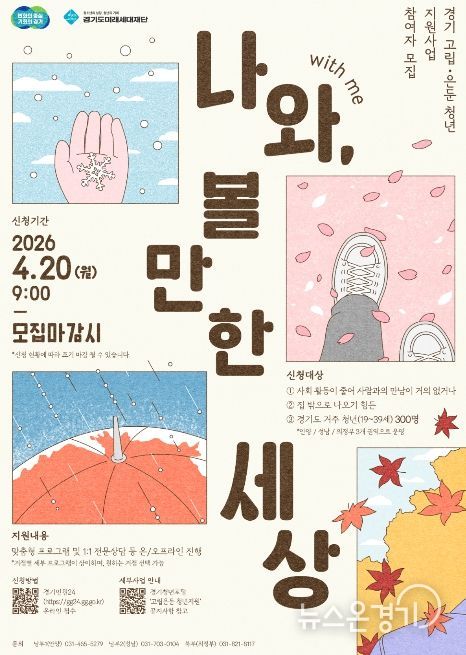 뉴스온경기 | 경기도가 사회적 관계가 단절된 고립·은둔 청년의 일상 회복을 돕기 위해 20일부터 ‘경기 고립·은둔 청년 지원사업: 나와(with me), 볼만한 세상’ 참여자 300명을 모집한다.