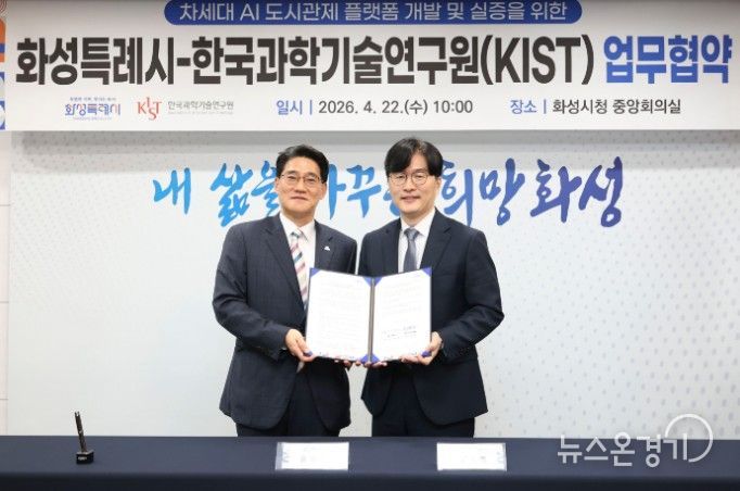 뉴스온경기 | 화성특례시는 도시상태정의 기반의 AI 도시관제 체계로의 전환에 본격 착수했다. 시는 22일 한국과학기술연구원(KIST)과 ‘차세대 AI 도시관제 플랫폼 개발 및 실증’을 위한 업무협약(MOU)을 체결했다.