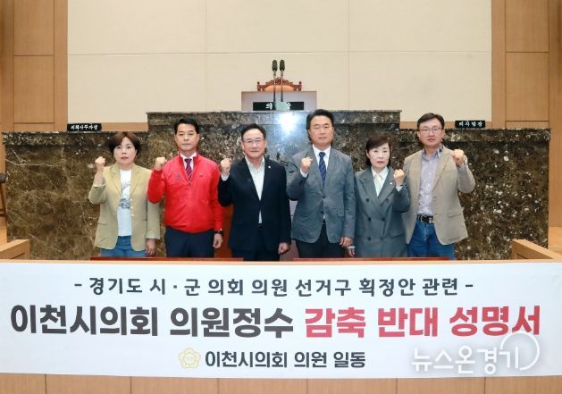 뉴스온경기 | 이천시의회 의원 일동은 23일 본회의장에서 “경기도 시·군의원 선거구획정안”과 관련해 이천시 의원 정수 감축에 반대하는 공식 입장을 밝혔다. 최근 경기도 시·군의원 선거구획정위원회가 경기도의회에 제출한 초안에는 이천시 의원정수를 기존보다 1명 축소하는 방안이 포함된 것으로 알려졌다.