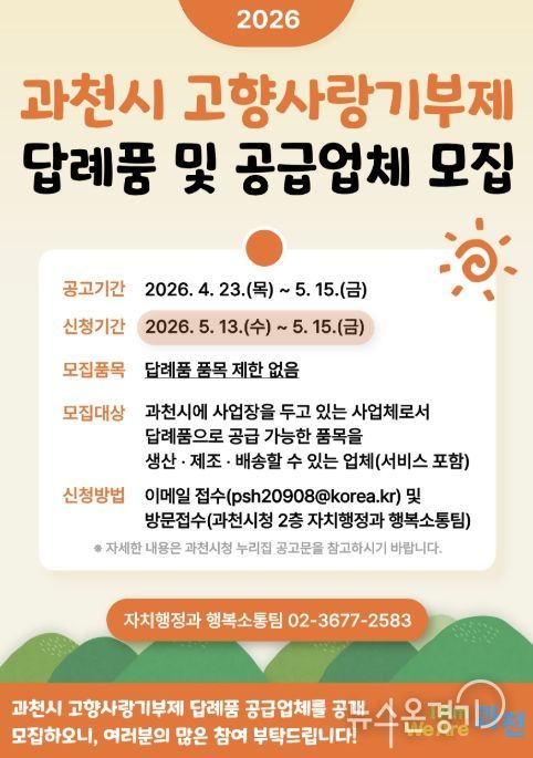뉴스온경기 | 과천시는 고향사랑기부제 활성화를 위해 답례품 공급업체를 공개 모집한다고 밝혔다.