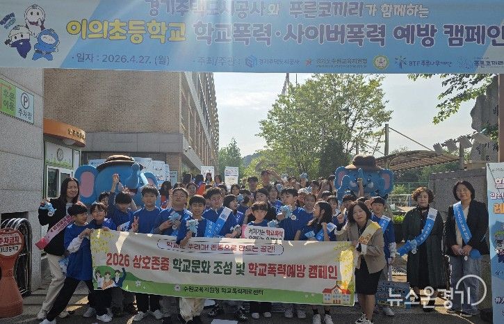 이번 캠페인은 최근 급증하는 청소년 사이버폭력 사안에 대응하고 건강한 디지털 시민 의식을 함양하기 위해 마련됐으며, 수원교육지원청을 비롯해 경기주택도시공사(GH), 푸른나무재단(푸른코끼리), 이의초 학부모회 관계자 등이 참여했다.