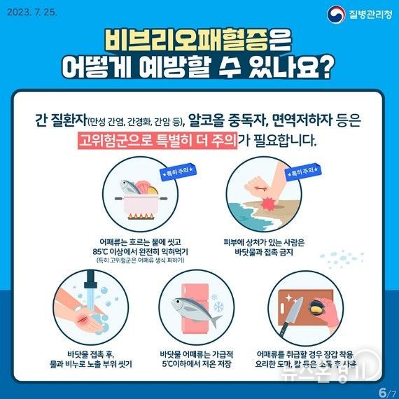 특히 만성 간 질환자, 당뇨병, 알코올의존자, 면역결핍 환자, 악성종양 등 비브리오패혈증 고위험군은 감염 시 치명률이 높으므로 더욱 철저한 주의가 필요하다.