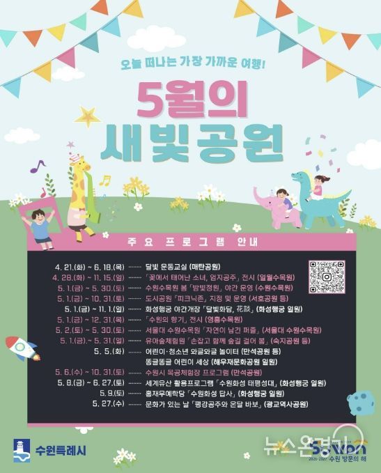 뉴스온경기 | 수원특례시는 5월 한 달간 도시공원과 수목원, 수원화성 일원에서 시민 참여형 자연·문화·체험 프로그램을 운영한다. 가정의 달을 맞아 가족 단위로 공원에서 여가와 체험을 함께 즐길 수 있도록 프로그램을 확대했다.