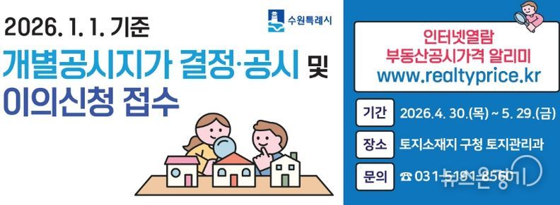 뉴스온경기 | 수원시 영통구는 2026년 1월 1일 기준 개별공시지가를 4월 30일 결정·공시하고, 5월 29일까지 이의신청 기간을 운영한다.