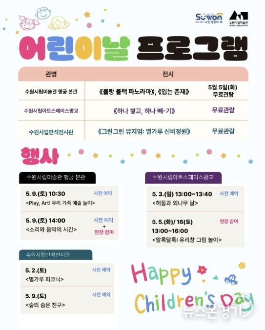 뉴스온경기 | 경기도 수원시립미술관은 2026년 어린이날을 맞아 수원시립미술관 행궁 본관, 수원시립아트스페이스광교, 수원시립만석전시관에서 즐거운 하루를 보낼 수 있는 전시와 다양한 프로그램을 운영한다.