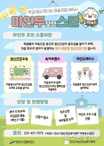 뉴스온경기 | 안산시 정신건강복지센터는 11월까지 관내 초·중·고등학교 총 10개교를 대상으로 학교로 찾아가는 정신건강사업 ‘마인두 오브 스쿨’을 운영한다고 30일 밝혔다.